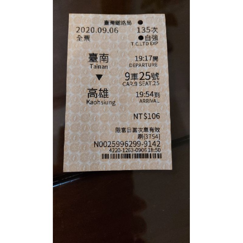台南高雄火車票2020 09 06 蝦皮購物